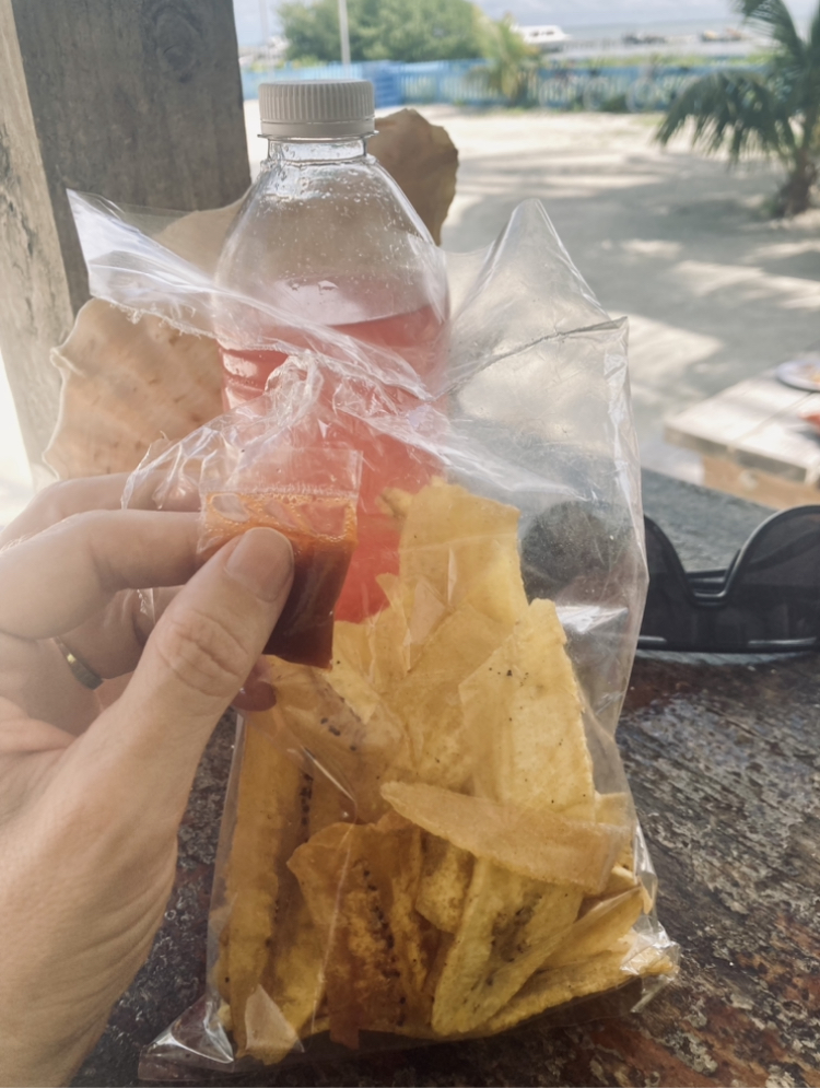 While I was sitting and speaking to maybe the fifth tourist of the day the plantain man came around again. He is a diminutive weather-worn Belizean man appearing to be of Mayan descent, who sells delicious bags of fried plantain chips, two bags for $5 BZD. He comes to the cafe I sit at regularly to sell his goods to patrons sitting outside on the picnic tables, and I frequently buy from him. His plátanos fritas are packaged nicely, mechanically sealed even. Whether or not they were placed into the bag with bare, dirty hands remains to be seen, but I’d rather not know. It’s better that way. They’re delicious, haven’t bothered my delicate stomach yet and go great with homemade guacamole. To recap: I am now sitting at the oceanside cafe five days a week or more, DahRoot the fruit vendor comes by and sells me fruits, veggies and doles out his brand of Rastafarian metaphysical life lessons trying to get me closer to enlightenment, and a nice old man sells plantain chips. What more could I want? The snacks come to me. This doesn’t quite make up for the inconvenience and somewhat substandard grocery stores we’ve got but it sure doesn’t hurt.