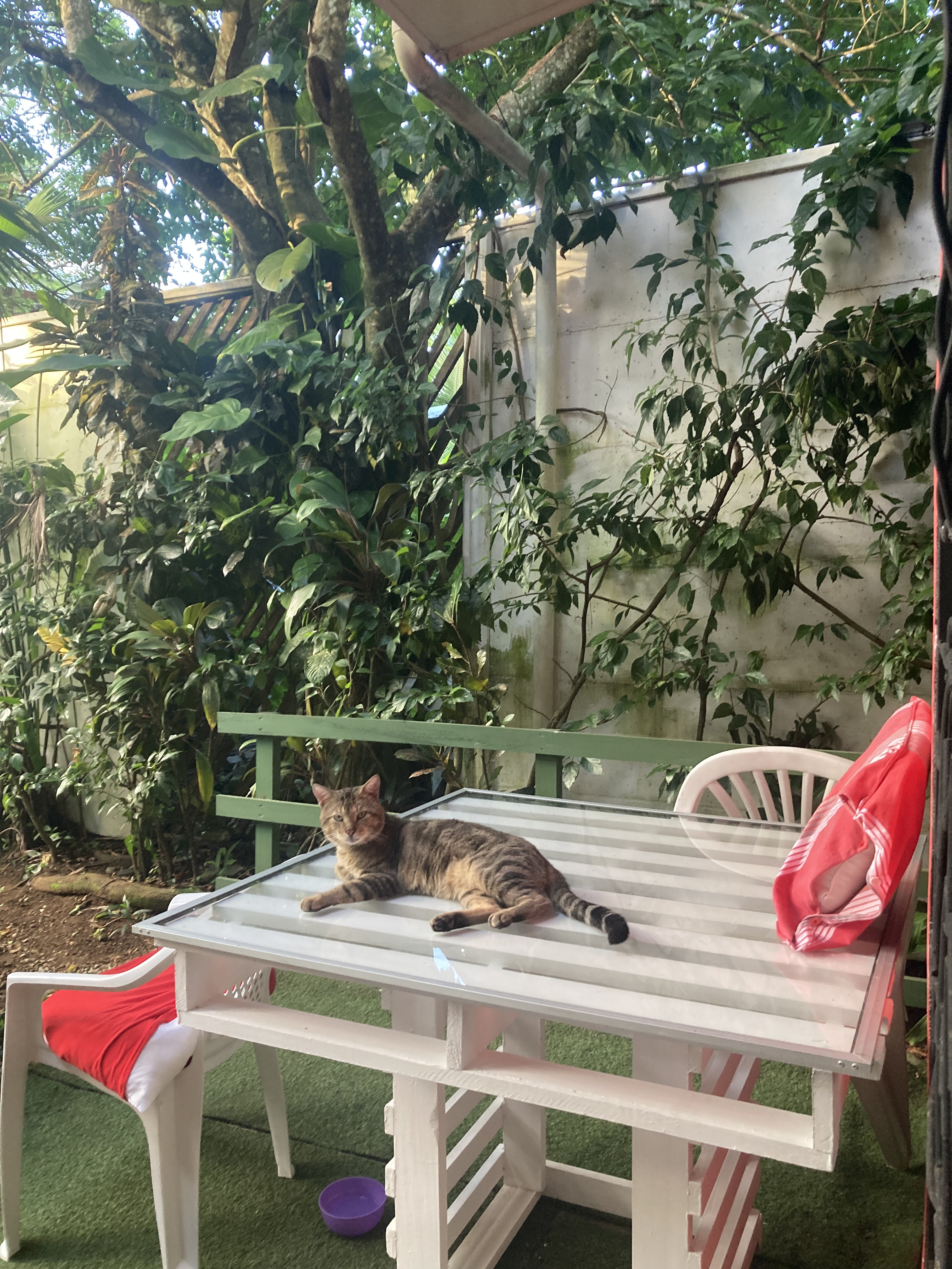 Mo the cat was the exception to that rule. When not walking the beach or going for weekly runs to Puerto Viejo for vegetables, I spent a lot of my day at home, writing, resting or cooking. I was so comfortable there, the property was gorgeous with vegetation and I left my huge glass door open so Mo could come and go as he pleased. He stayed most days for at least five hours to nap and supervise the rest of my activities before leaving and returning in the evening for his dinner. I could hear as many tropical birds as I wanted, howler monkeys every day and I watched little lizards climb the walls inside and outside my house. I even watched a couple big green iguanas while in the hammock one day.