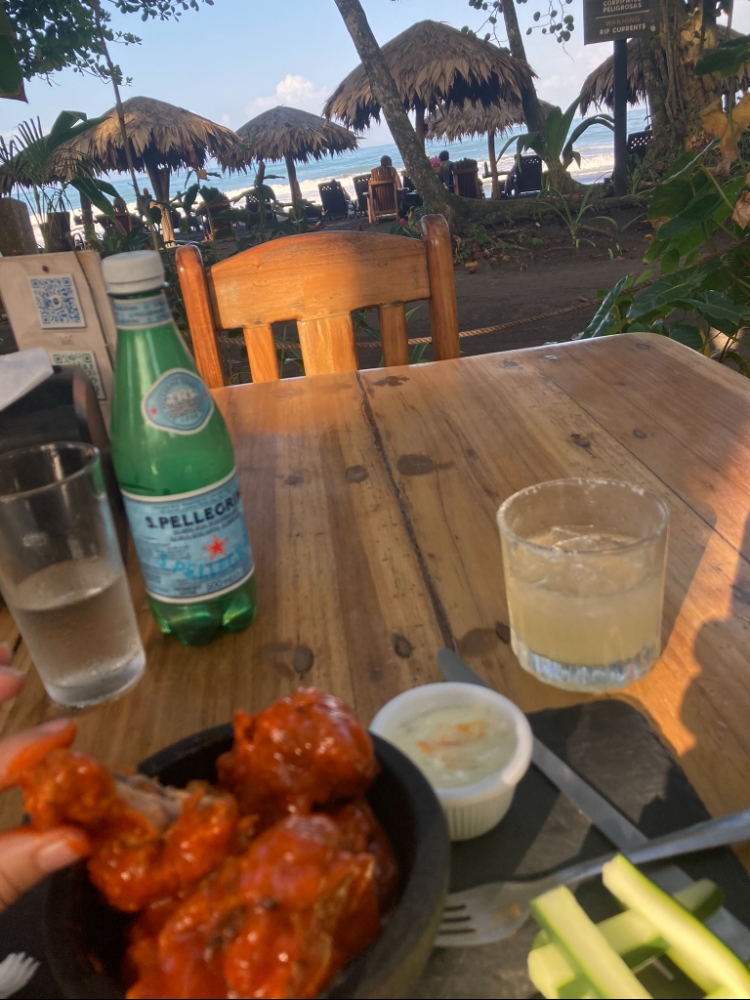 During my time living in this location, I’ve developed this unnatural and intense craving for buffalo chicken wings while living in Costa Rica. It’s not their national dish or anything (gallo pinto is), they just make amazing “alitas” – wings – at a restaurant near my house. They’re served creatively, on a rectangular piece of slate. Sitting on the slate is a small bowl of wings piled high, drowning in slightly spicy buffalo sauce, accompanied by an architectural masterpiece of cucumber and carrot sticks stacked in a cube shape. Most importantly, they didn’t forget the blue cheese dipping sauce, in a little pot next to the veggie stack. Blue cheese is a must for me with chicken wings. It even helps me ignore the fact that celery is sort of a deal breaker too if it’s not present, but wings served on the beach with cucumber instead of celery gets an automatic pass. We’ll live.